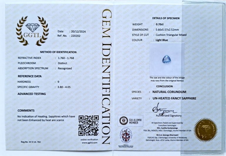 This sapphire features excellent clarity with a soft pastel blue color, reminiscent of a serene sky blue. Its eye-clean appearance and optimum vitreous luster make it a gem of understated elegance, perfect for those who appreciate subtle beauty and refinement.